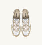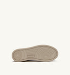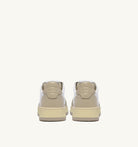 Crafted from soft, authentic leather, it features a bold color-block design in white and beige, paired with a natural rubber sole and beige tread that complements the rhythm of your steps.