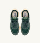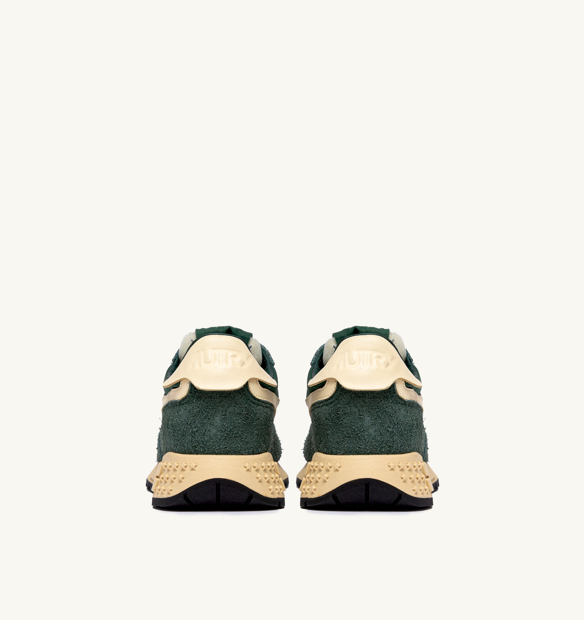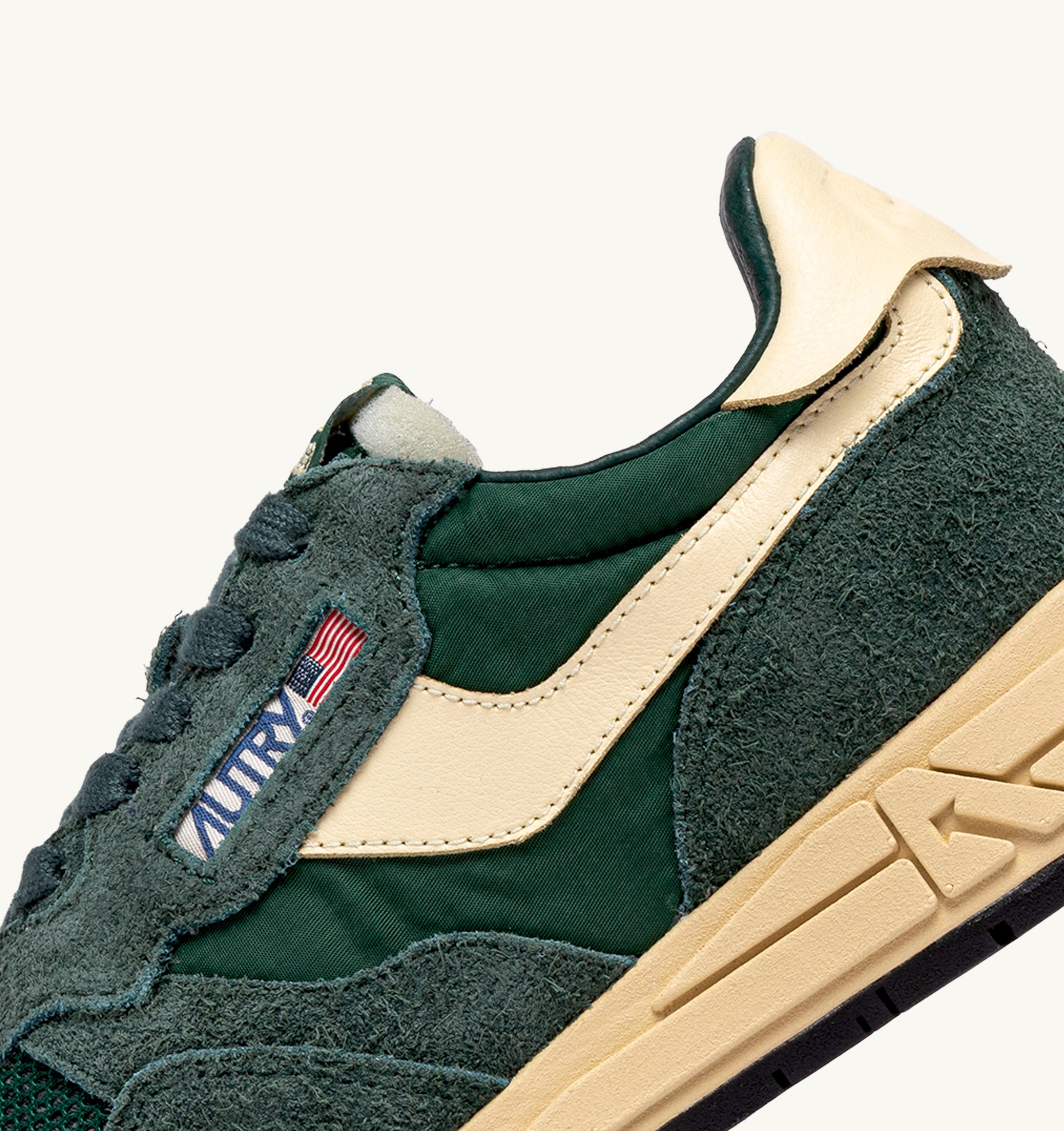 Reelwind low sneakers offer the technical edge of a performance sports shoe with the unmistakable style of the Autry aesthetic. This men’s athletic shoe is crafted from dark green nylon and is reinforced by inserts in color matching suede and ivory white leather that create a dynamic design.
