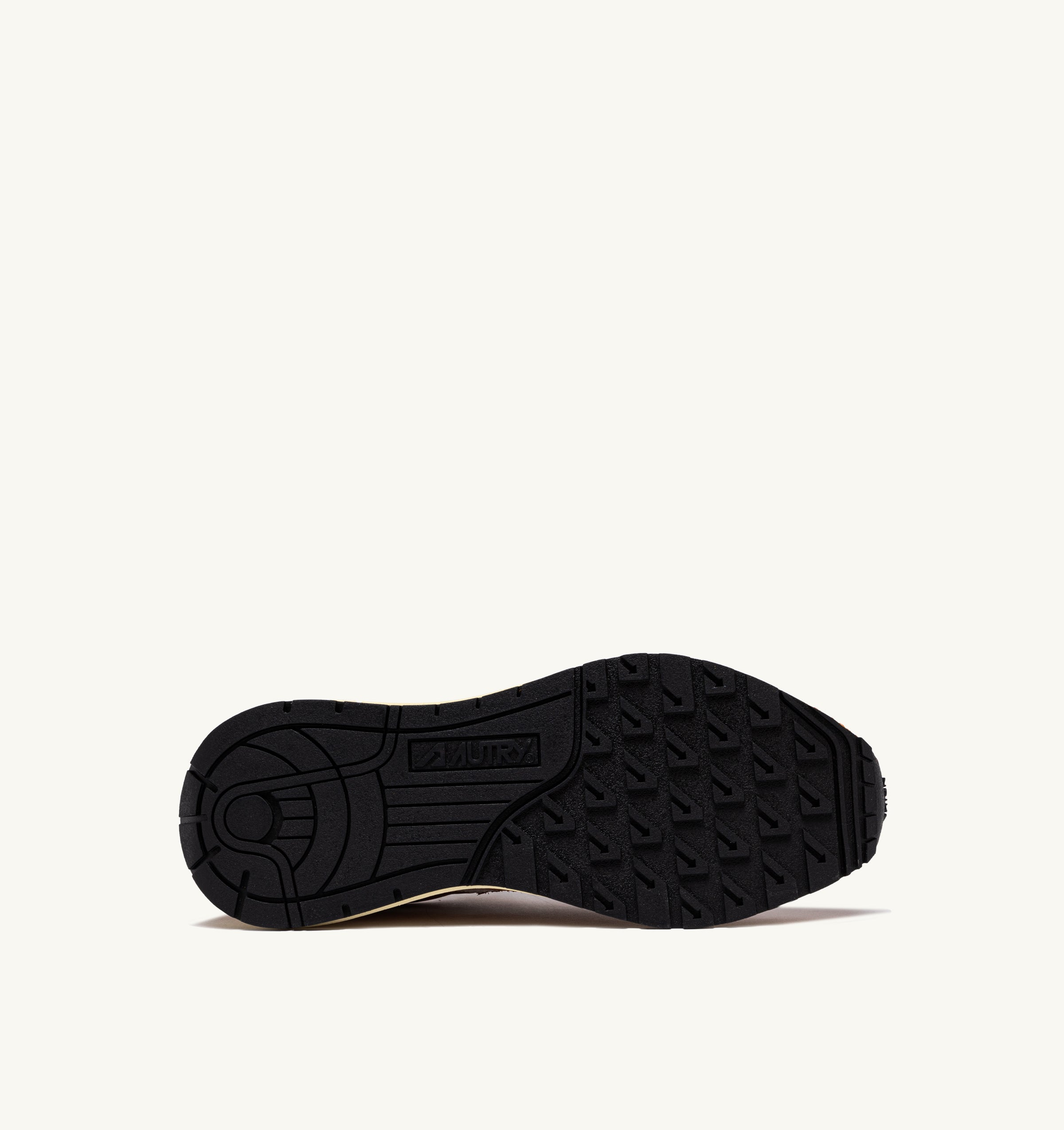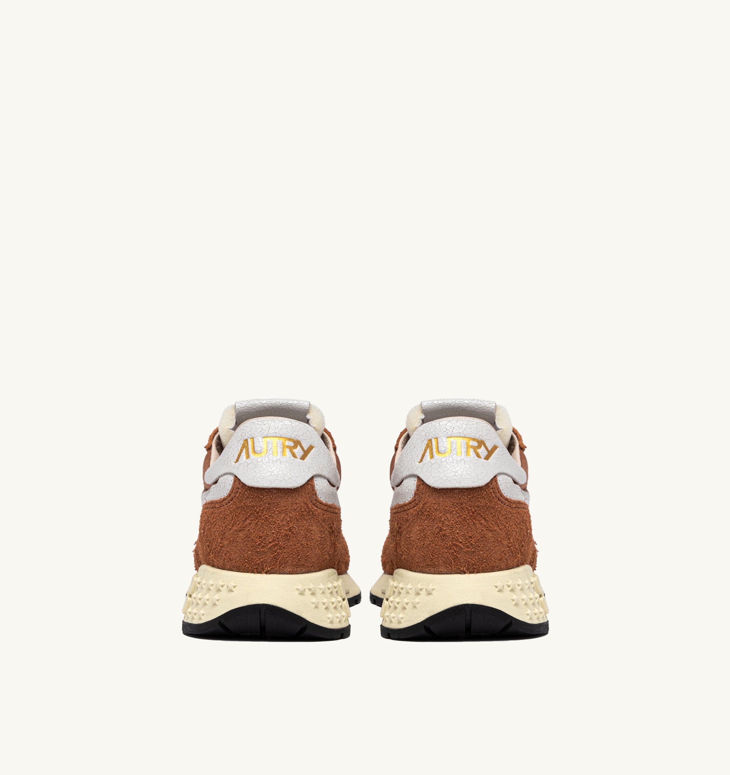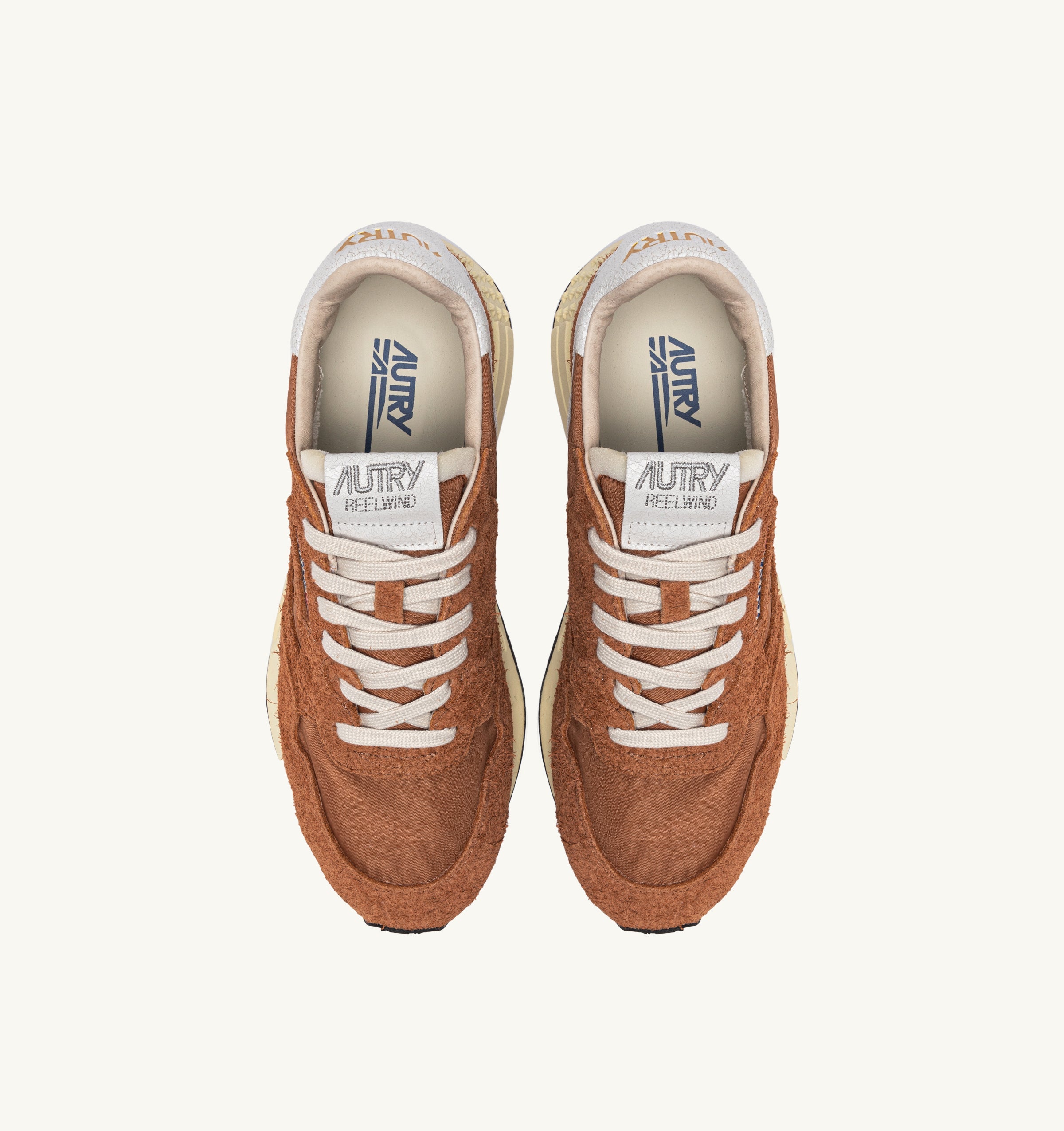 Sporty performance and metropolitan lifestyle. The men’s Reelwind sneakers explores street dynamism with a panel construction that combines nylon and suede in color matching brown tones, accented with crackle-effect white leather inserts.