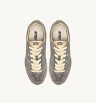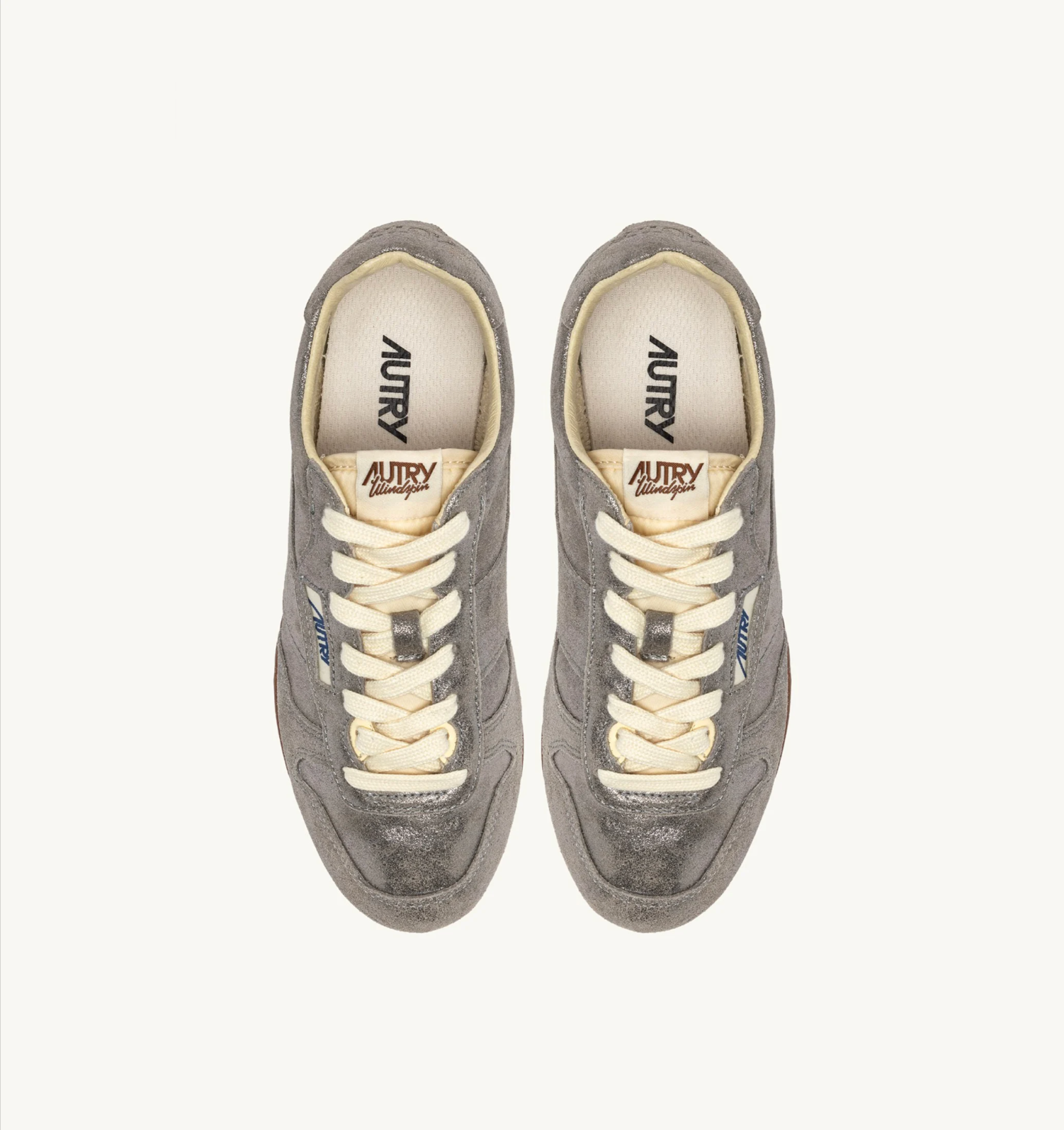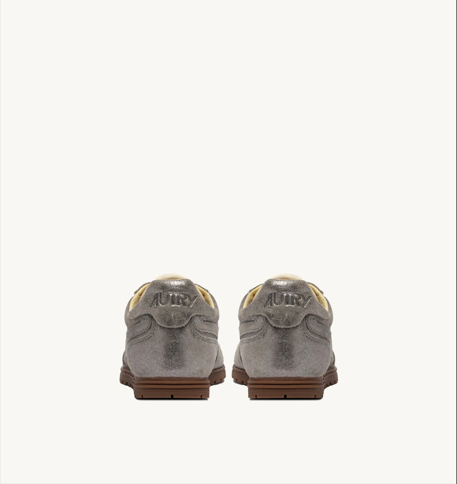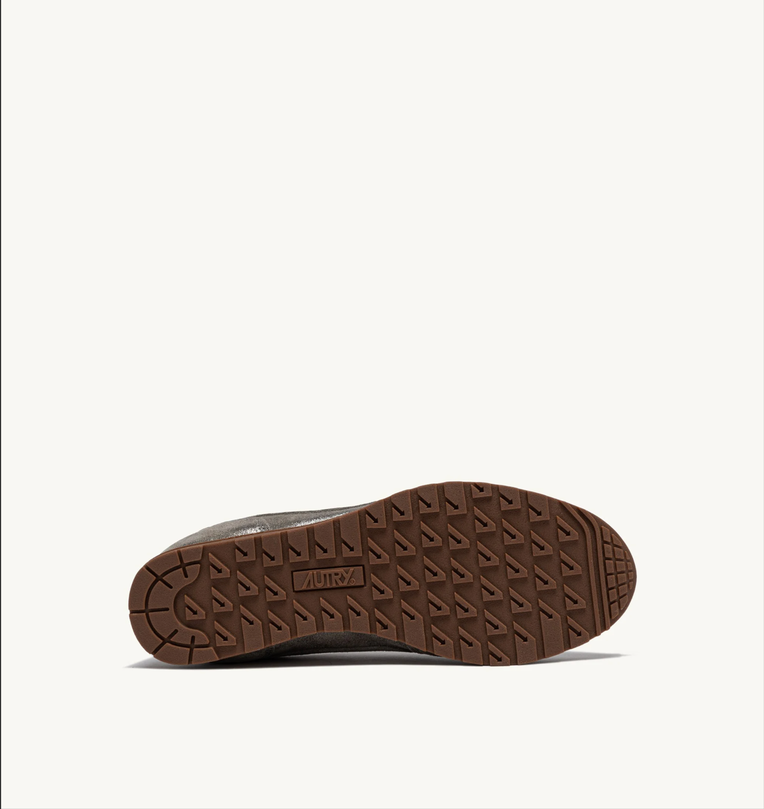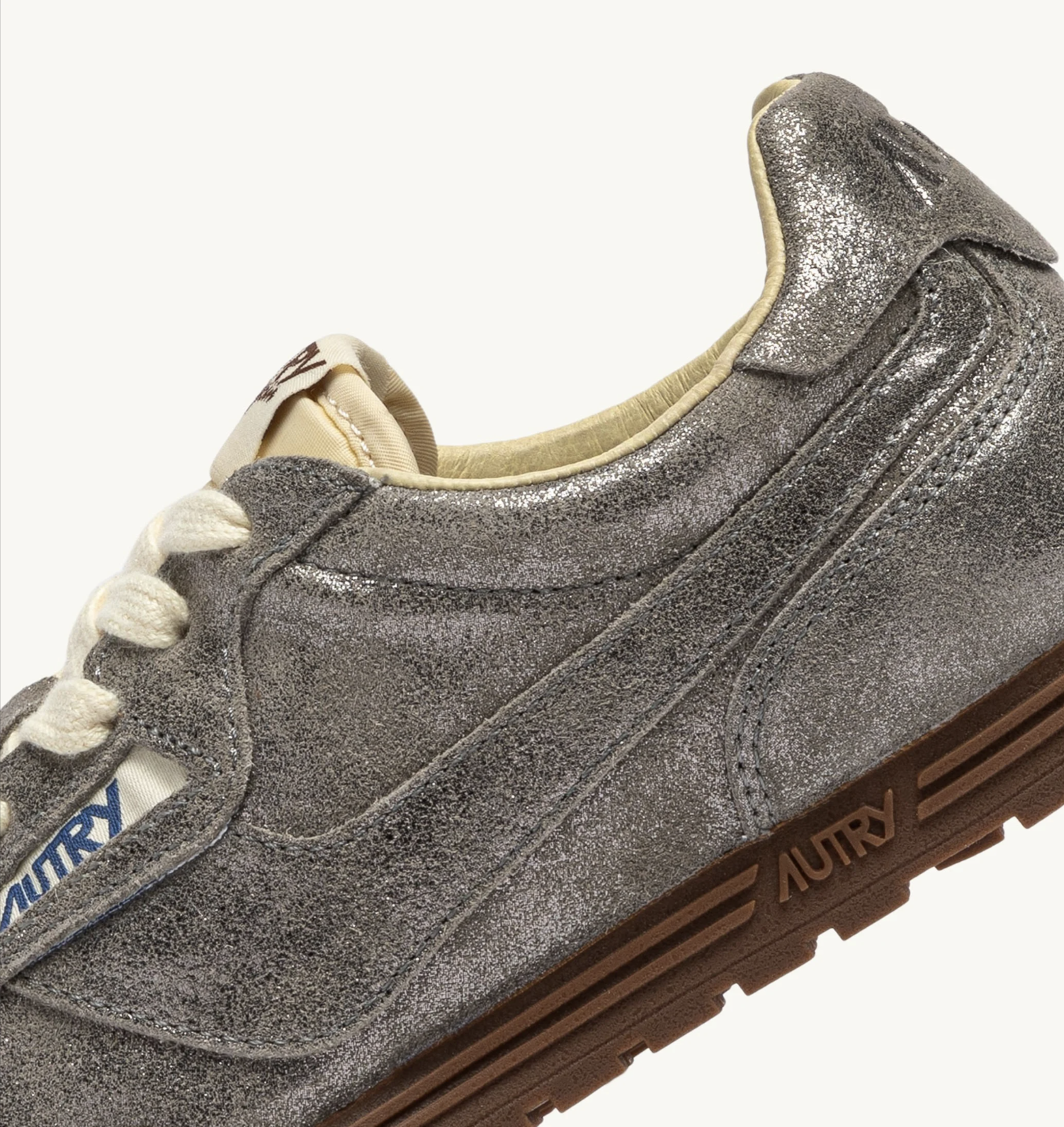 Crafted from silver-tone glittered suede with tone-on-tone inserts, the Windspin features a sleek, streamlined silhouette. Its flat, dynamic profile embodies Autry’s signature fusion of vintage charm and modernity. The ultra-flat rubber sole ensures excellent grip on all urban surfaces.