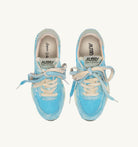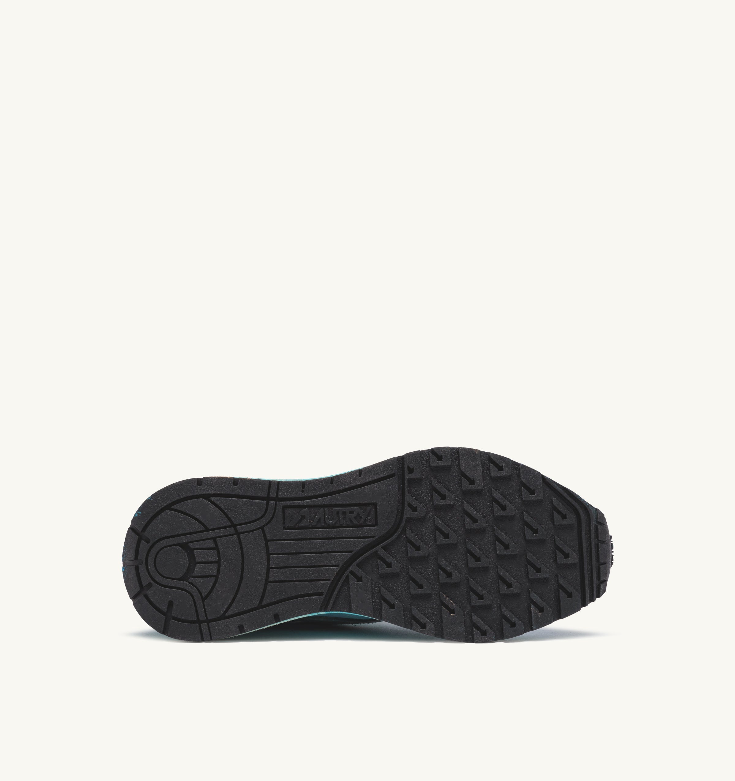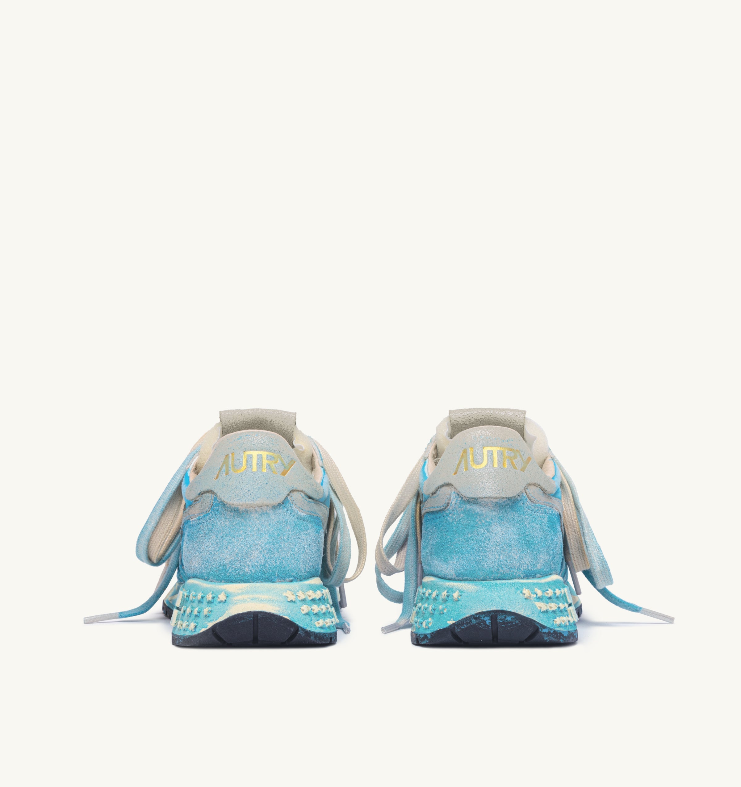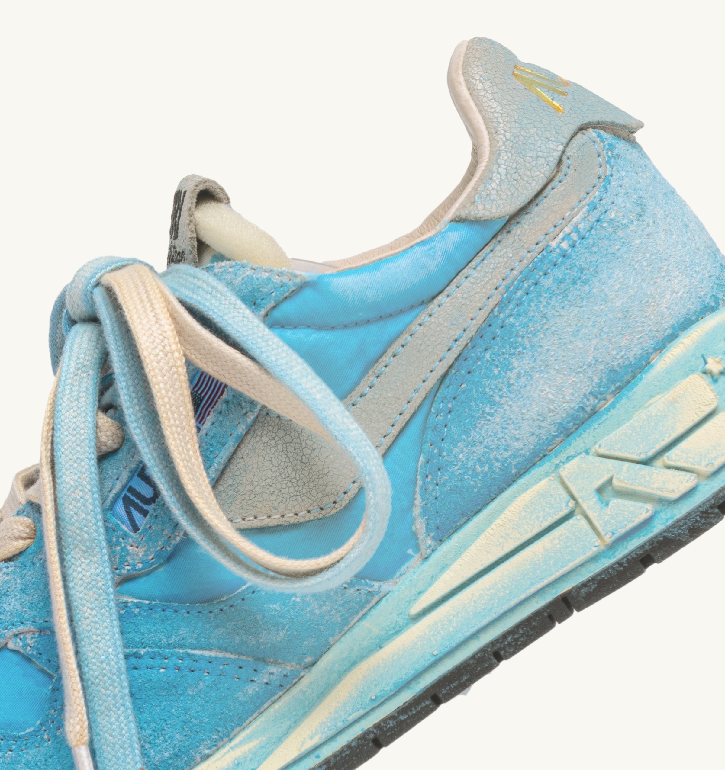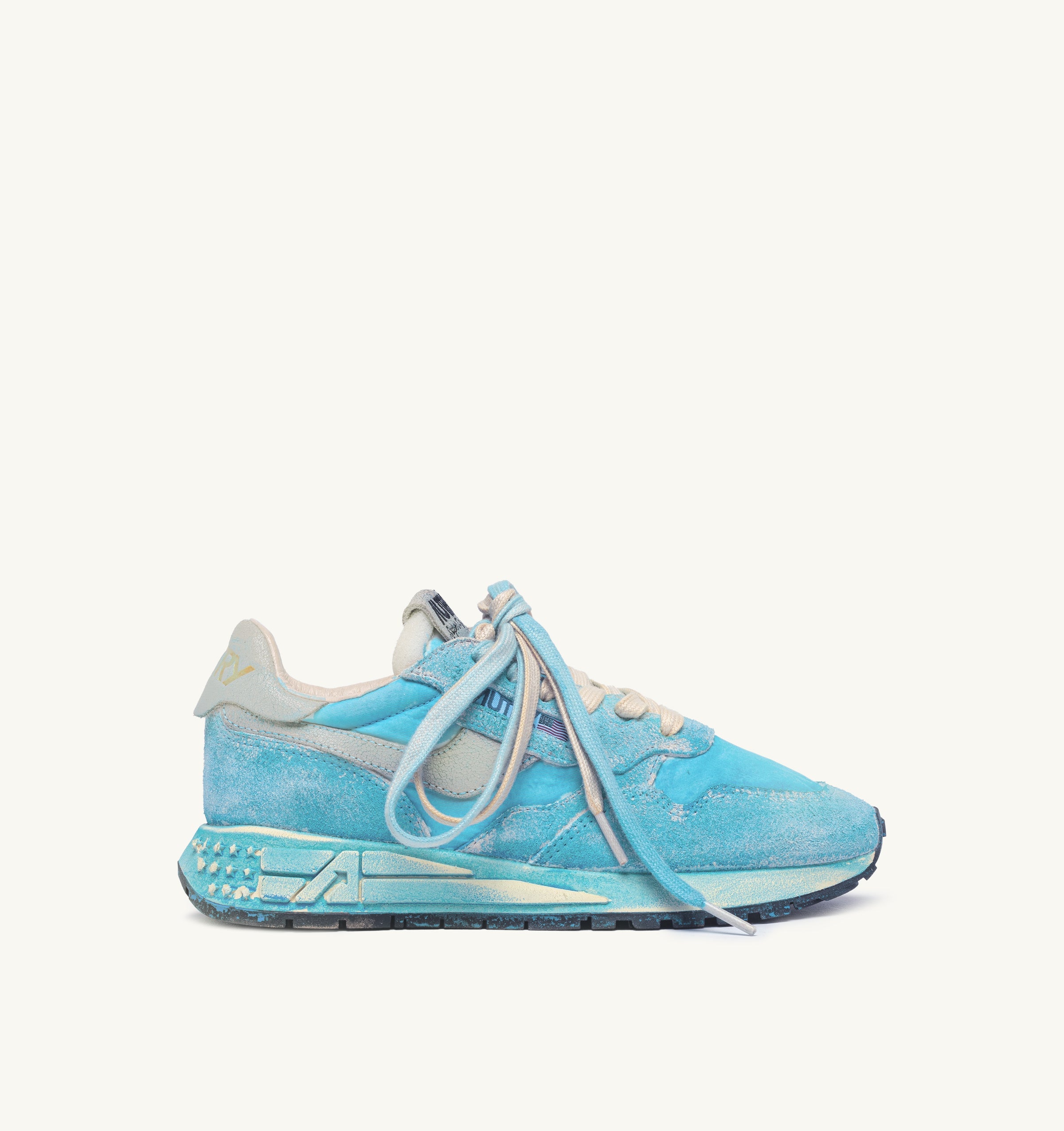 Innovative, light, and extremely flexible, Reelwind draws inspiration from the running world, enhanced by artisanal treatments that give each style a distinct, irregular, and unique used appearance. This model is crafted from a mix of azure suede and nylon with side overlays in gray crackle-effect leather.