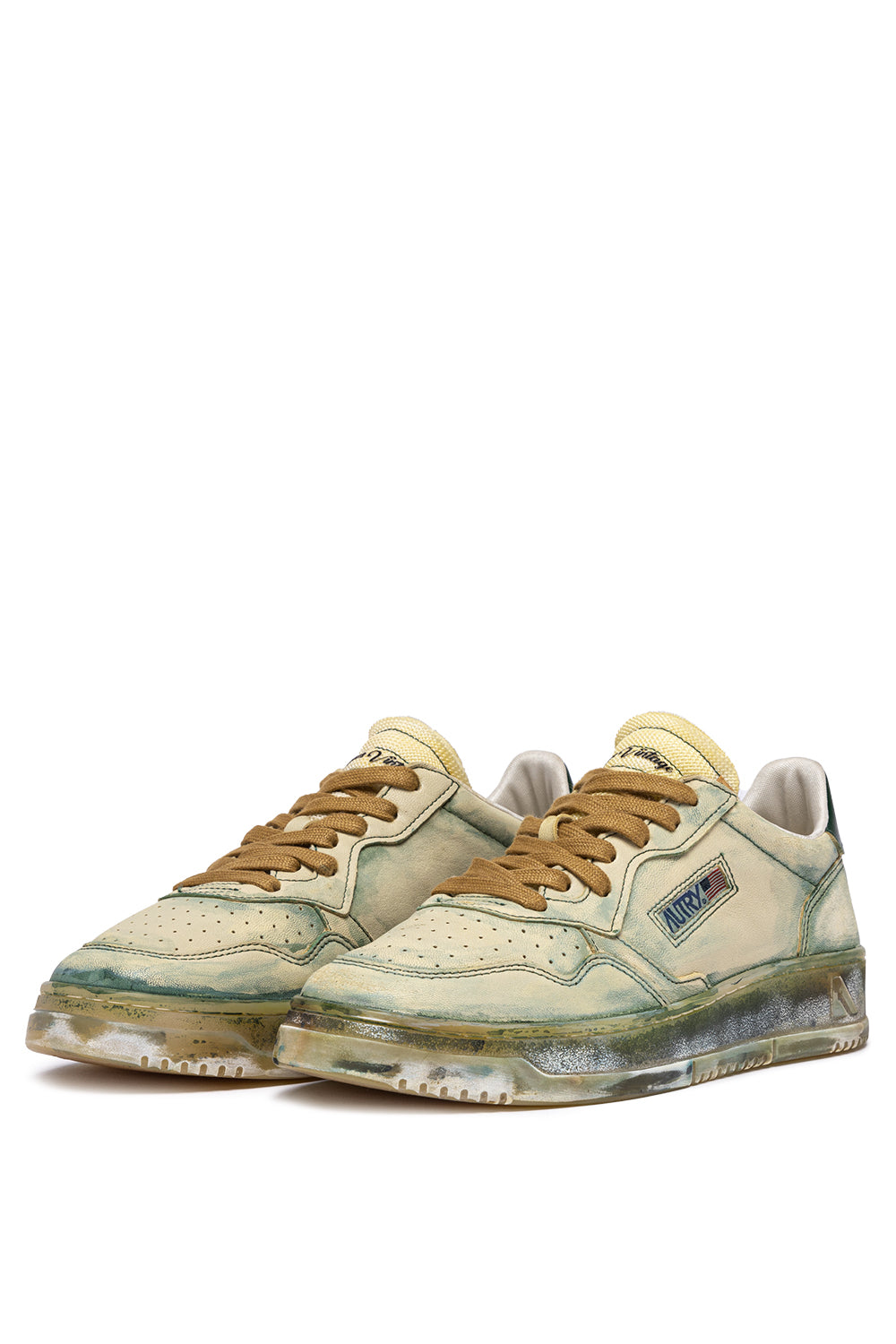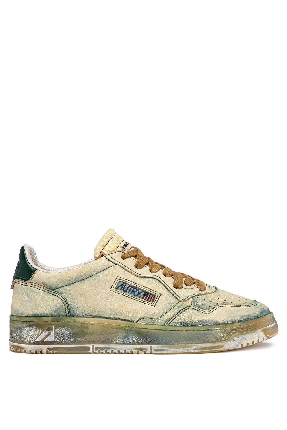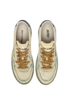 This sneakers is crafted from beige smooth leather with lived-in effect green hues. The side insert draws attention to the jacquard Autry logo.