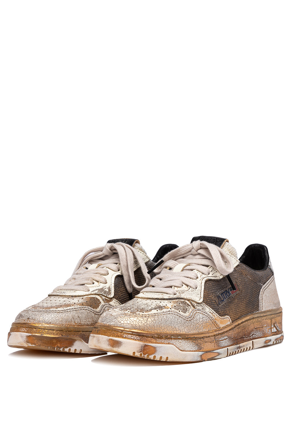 This sneakers is crafted from smooth leather and crackle-effect white leather with a lived-in look, complemented by brown mesh inserts. The side insert draws attention to the distinctive Autry logo.