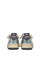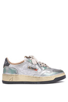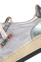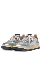 These women's sneakers are made from silver-tone metalized leather with a lived-in appearance and details in green hues. The side insert draws attention to the distinctive Autry logo. The exclusive treatment used to create the vintage look is entirely Made in Italy.